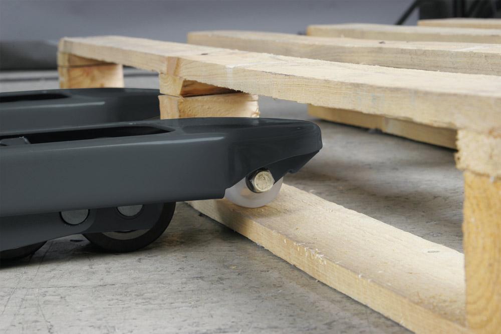 Řiditelná kola z polyamidu a dvojitá vidlicová kolečka z polyuretanu.