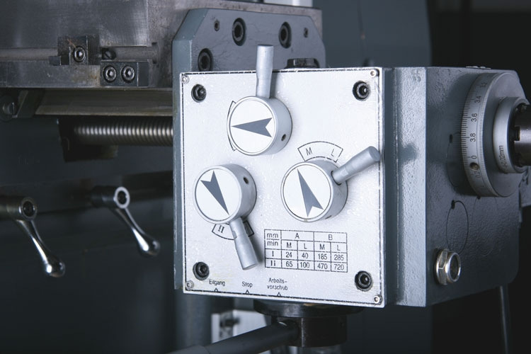 Posuv pinoly pomocí tří pákových rukojetí (vrtání) nebo pomocí ručního kola jemného posuvu.