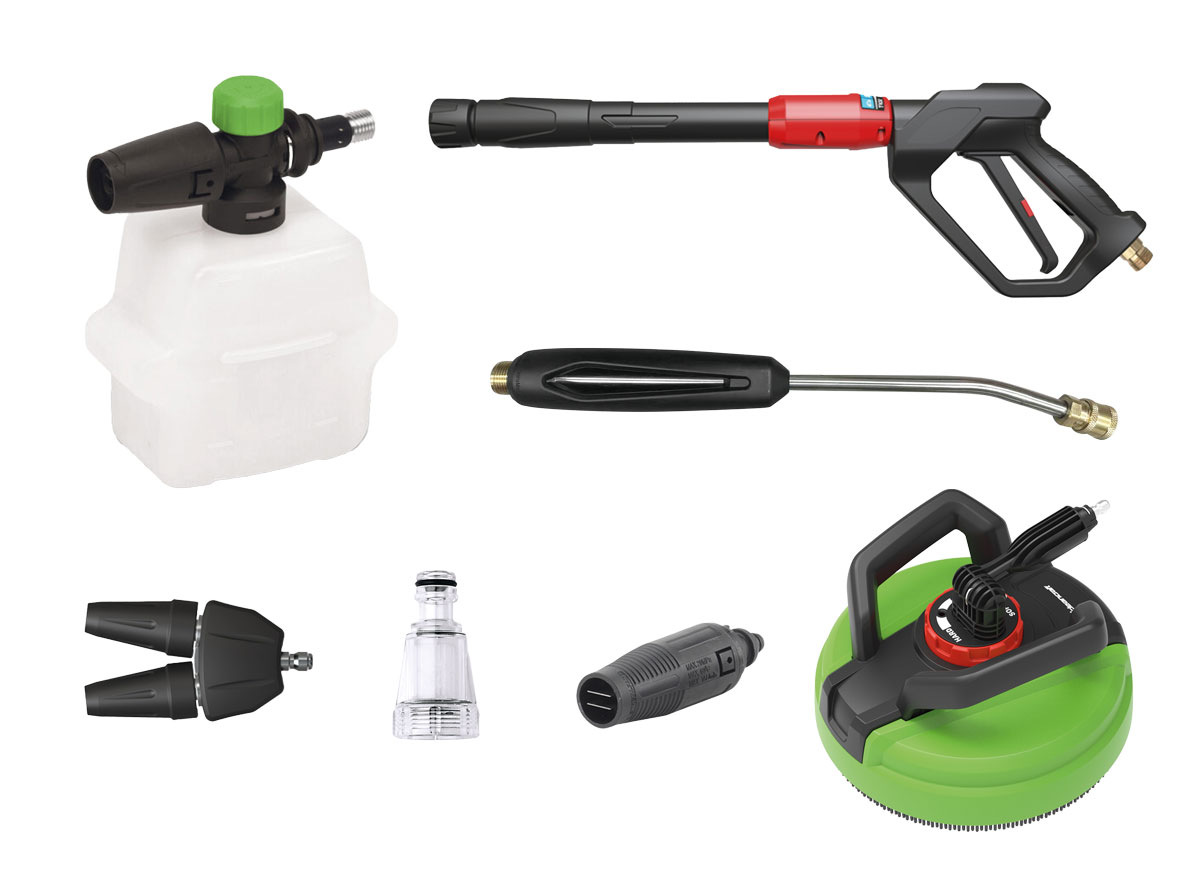 Praktické držáky pro stříkací pistoli, trubici, vysokotlakou hadici a napájecí kabel.